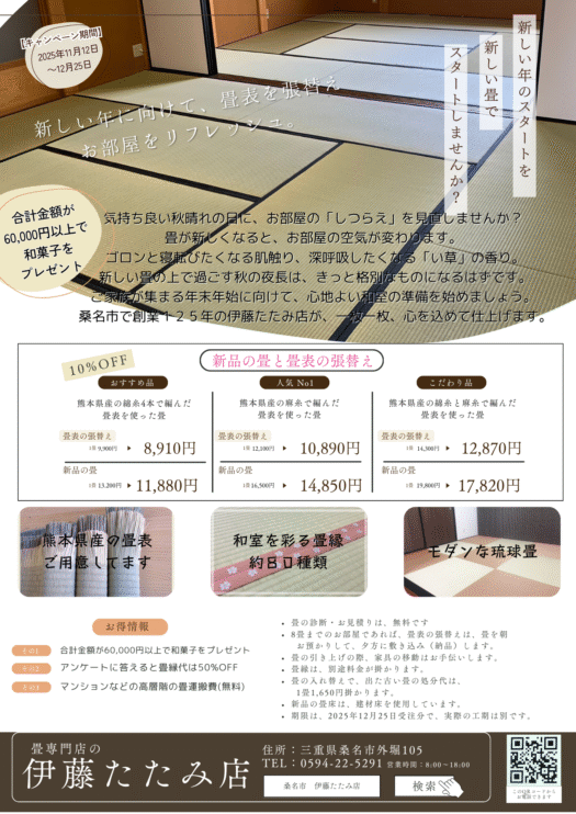 桑名市で創業125年の伊藤たたみ店が、一枚一枚、心を込めて仕上げます。